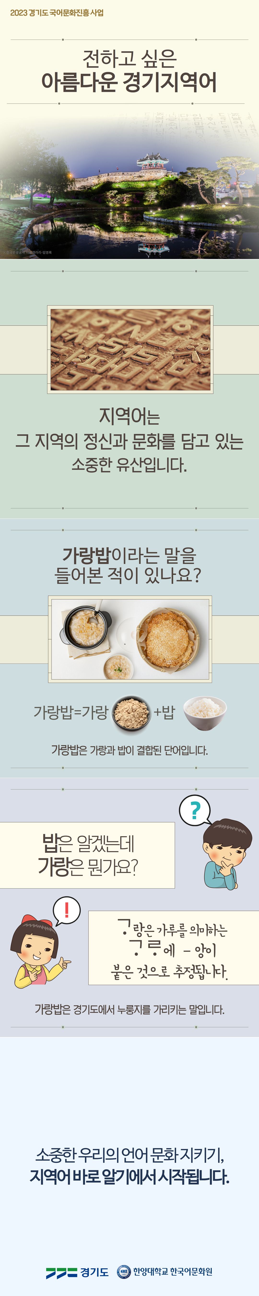 '2023 경기도 국어문화진흥사업'의 하나로 경기 지역어 보전을 위한 홍보 자료를 만들어 배포하고 있습니다.