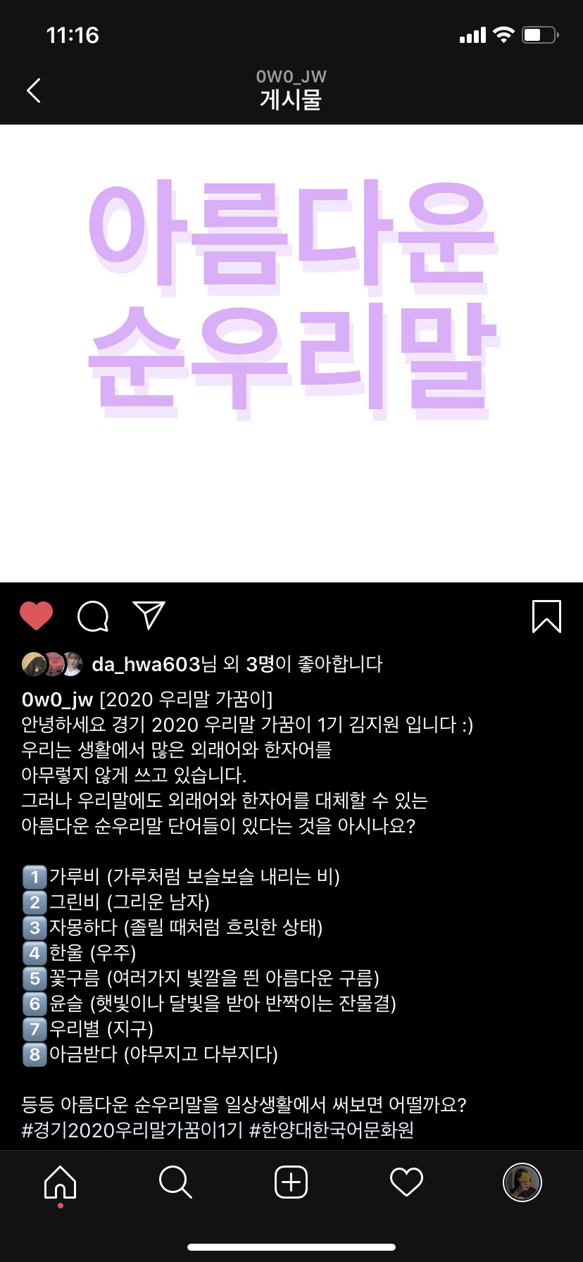 인스타그램에 순우리말 단어에 대하여 업로드 하였습니다.