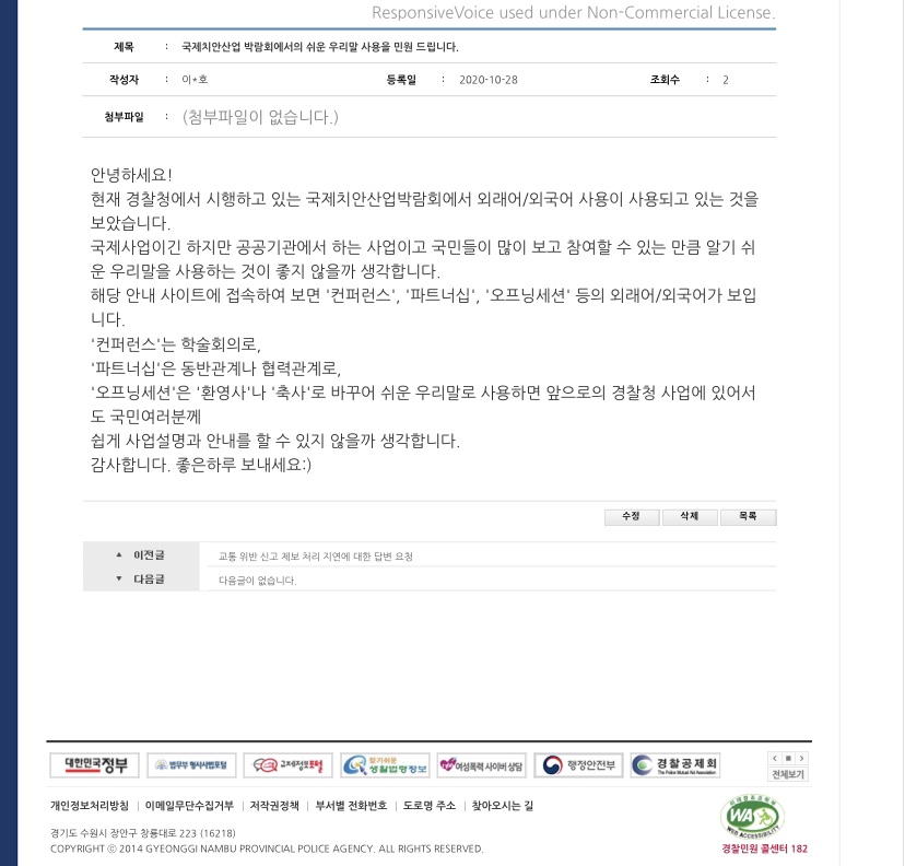 경기남부경찰청 민원자유게시판에 올려 개선을 신청하여 보았습니다.