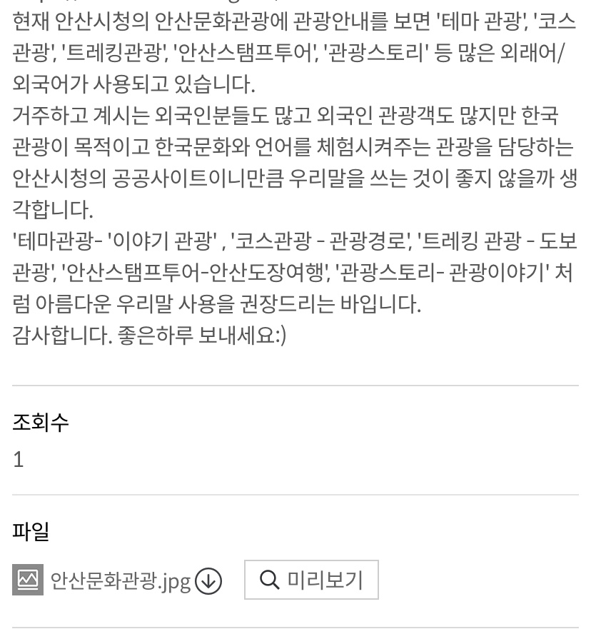 관광안내에 외래어 사용이 많은 것을 발견하여 안산시청에 공공언어개선을 바라는 글을 올려보았습니다.