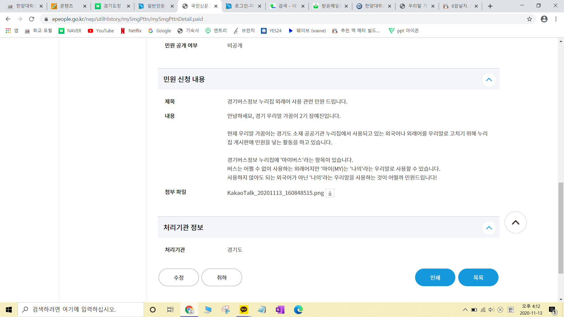 경기버스정보 누리집에는 민원 게시판이 없어 경기도청에 민원신청을 넣었습니다!