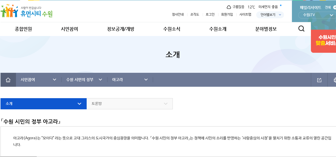 수원시청 누리집에 시민의 소리와 의견을 반영하는 공간으로 '아고라'라는 공간이 개설되었지만, 외래어인 명칭이 이해하기 힘들 것 같아 의견을 반영하고 소통한다는 취지를 잘 나타내는 '열린 광장' 이라는 명칭을 제안하는 글을 작성하였습니다.