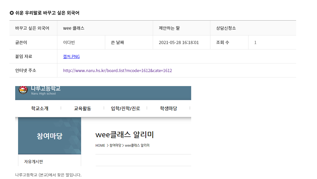 나루고등학교 본교에서 찾은 wee 클래스라는 단어를 보고 상담신청소라고 바꿔서 사용을 하면 어떨까 해서 작성하게 되었습니다.