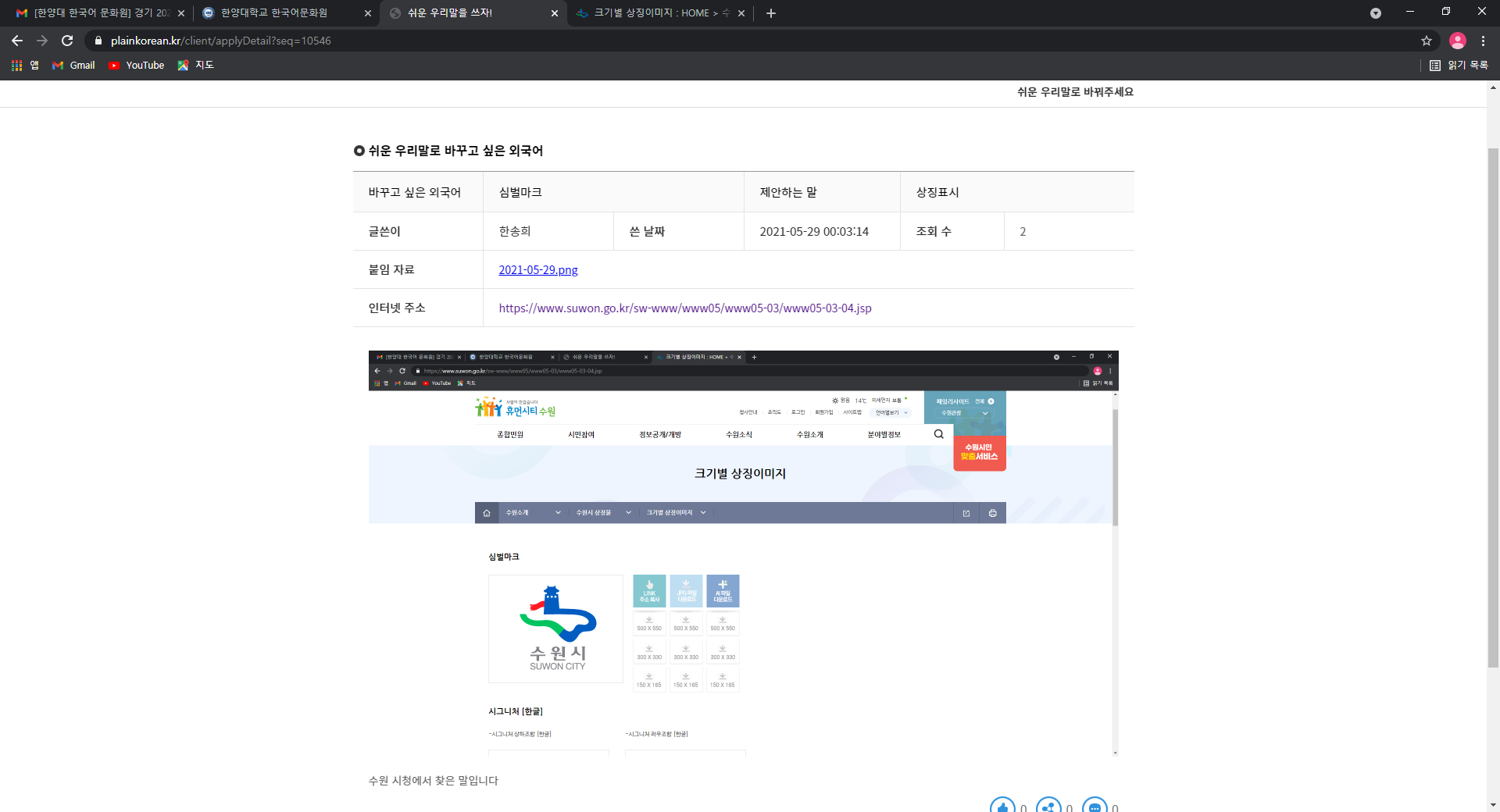 쉬운 우리말을 쓰자 활동입니다. 수원 시청에서 찾은 말로 심벌 마크를 상징 표시로 바꾸는 것을 제안하는 게시글을 올렸습니다.