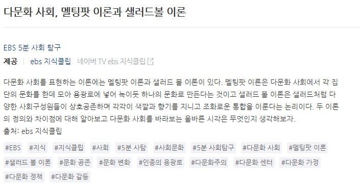 흔히 샐러드 볼 이론이라는 개념어로 사용하며, 이 뜻은 샐러드처럼 다양한 사회구성원들이 상호공존하며 각각이 색깔과 향기를 지니고 조화로운 통합을 이룬다는 논리이다. 그러나, 이러한 개념을 우리 한국어의 문화에 접하여 비빔밥 이론이라는 정의를 도입하면 어떨까 제안하였다.