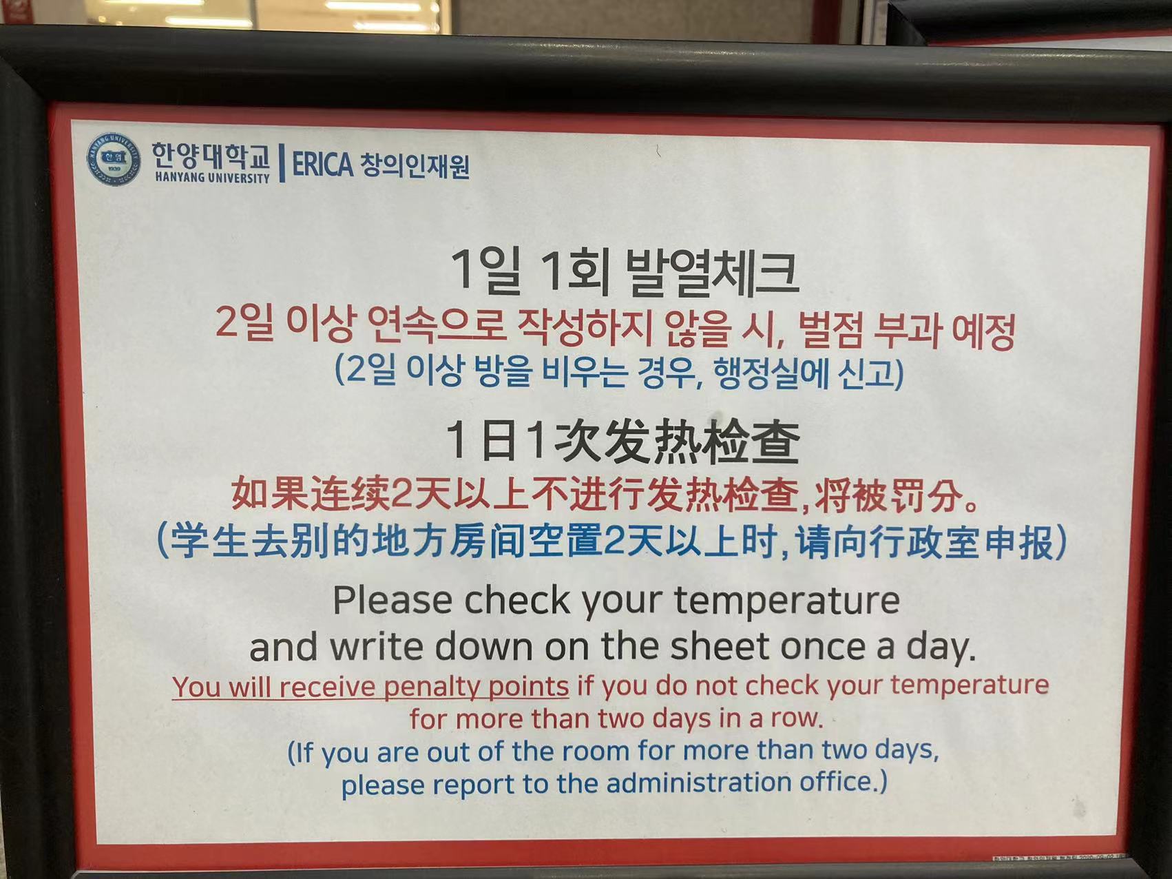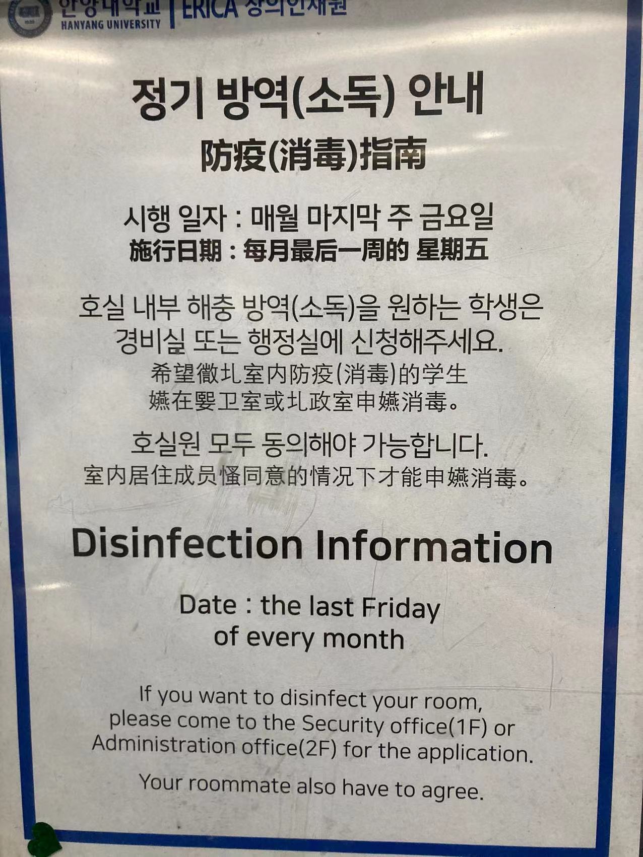 저의 조사대상은 안산 한양대학교 기숙사 방역소독지침입니다. 한국은 현재 매우 심각한 상황이기 때문에 개학시기에 맞춰 전세계 각지에서 학생들이 기숙사를 방문하여 비교적 많은 인파가 몰리고 학생들의 주거가 밀집되어 있고, 학생들의 건강상태를 위해 기숙사 곳곳에 다국어 소독을 실시하여 주의사항을 더 잘 이해할 수 있도록 하고 있으며, 최근에도 학교 기숙사마다 확진자가 속출하는 등 심각한 상황입니다. 학교에서는 기숙사마다 학생들에 대한 일제 소독을 실시하고 있습니다.안전한 생활공간에서 생활하고 공부할 수 있도록 보장한다.조사 결과 현재 국내외 학생들은 기숙사에서 인터넷 수업을 하는 등 인원이 집중돼 있으며 학교는 전교생의 안전을 고려해 매일 기숙사 학생들을 발열 검사하고 학생 개개인의 건강상태를 모니터링하며 확진자의 재발을 막고 이틀 연속 측정하지 않으면 상응하는 처벌을 받는 등 엄격한 조치를 취하고 있다.한양대학교의 상황 중시 학생에 대한 책임감 그리고 있다.