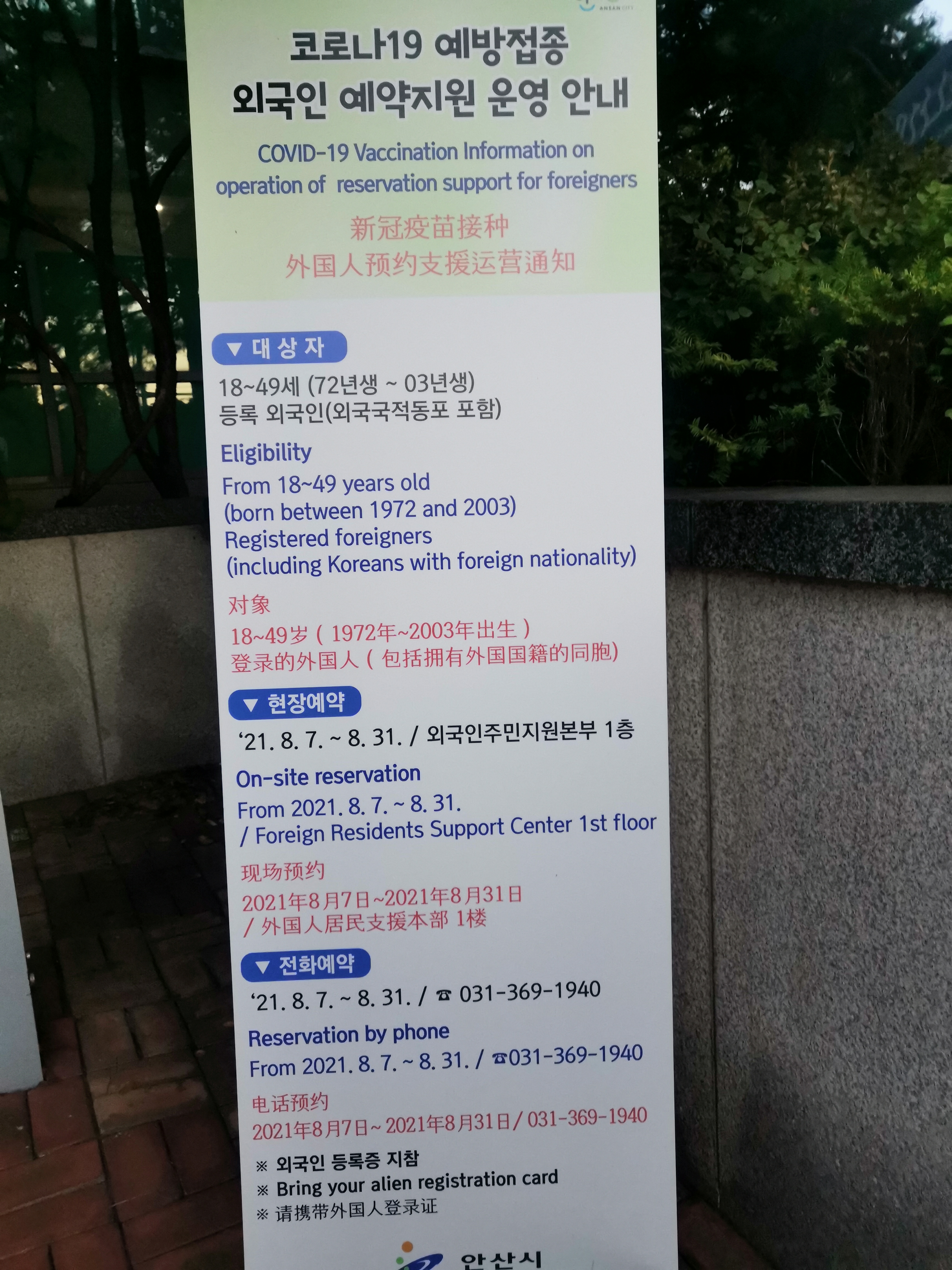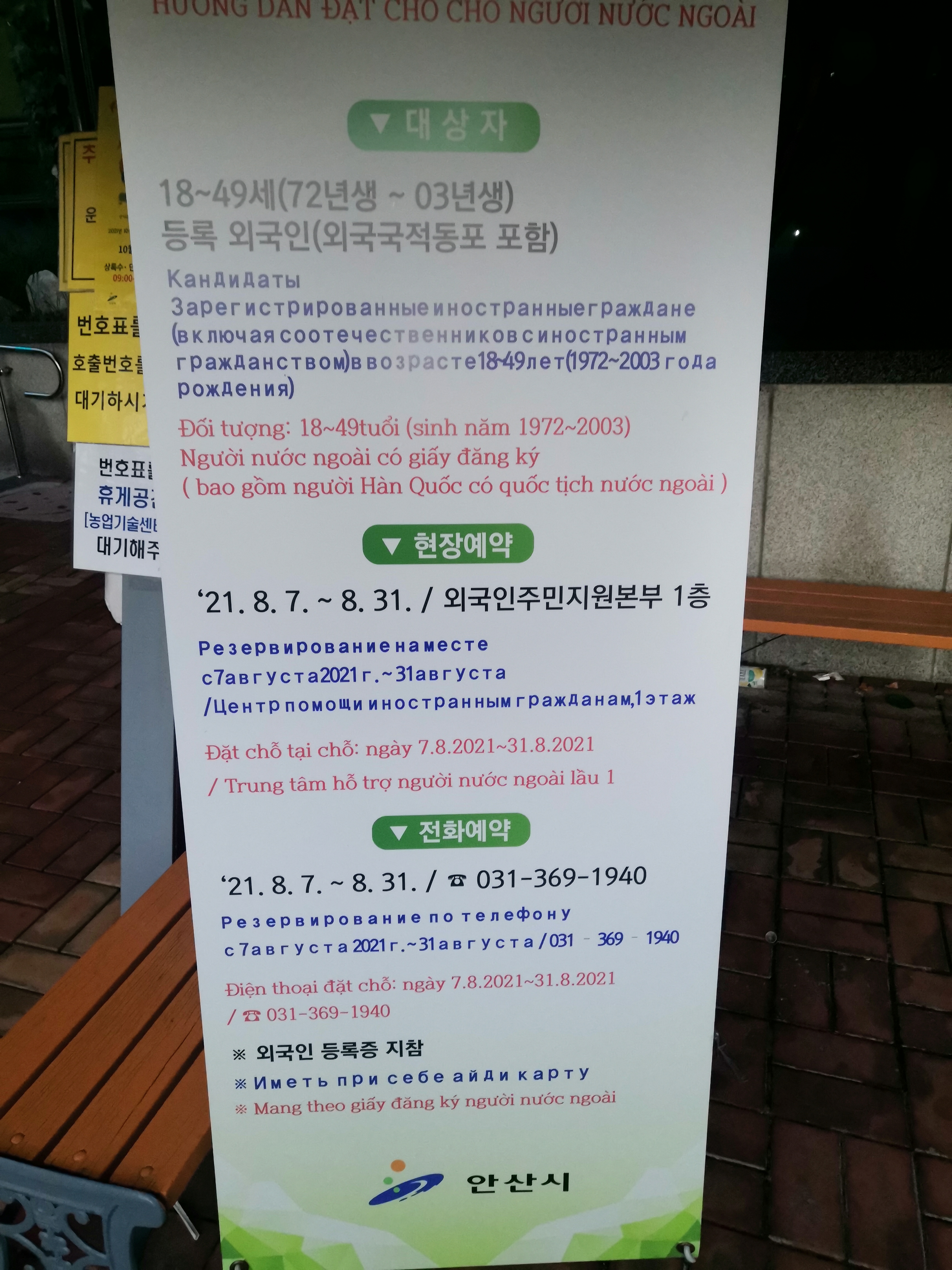 오늘은 날씨가 아주 좋습니다. 그런데 오늘은 한국 역사상 환자가 가장 많이 발생한 날입니다. 추석 연휴에 한국인들이 모두 집으로 돌아가 명절을 쇠기 때문에 사람들이 비교적 많이 모이고 유동량이 많기 때문에 발생이 가중되고 있습니다.정부가 사태 진작을 위한 백신 접종을 점진적으로 시작했다.안산시는 국내 거주 외국인이 가장 많은 곳으로, 안산시청은 환자 발생을 억제하고 외국인의 생명과 안전을 위해 노력하고 있다.안산시는 코로나19 백신 접종 외국인 예약지원 예약 안내를 했다.이번 접종 대상은 1849세 외국인으로 19722003년생 외국 국적 동포다.이번 백신 접종은 현장예약과 전화예약으로 나뉜다.예약기간은 2021년 8월 7일부터 2021년 8월 31일까지이며, 외국인등록증을 본인이 지참하고 외국인주민지원본부 1층으로 가서 예약할 수 있으며, 031-369-1940으로 전화하여 온라인으로 예약할 수 있습니다.