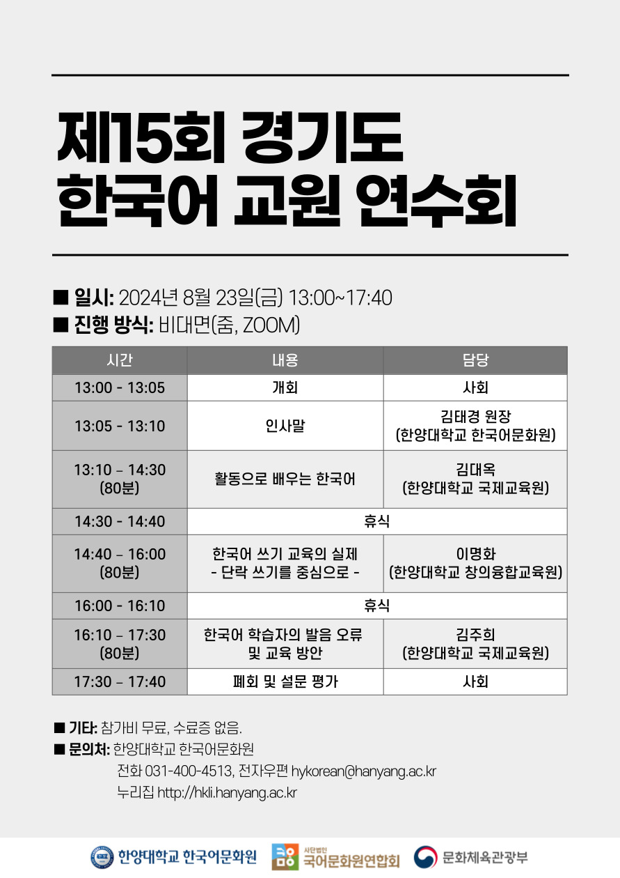 한양대학교 한국어문화원(원장 김태경)은 오는 8월 23일(금) ‘제15회 경기도 한국어 교원 연수회’를 진행한다. 연수회는 한국어 교원의 능력을 강화하고 전문성을 확보하는 데 도움을 주는 한국어 교원 대상 재교육 프로그램으로 2011년부터 시작되었다.