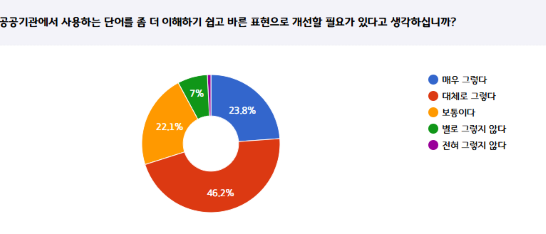 대체어 선정에 앞서 한국어문화원은 경기도 여론조사 누리집(홈페이지)을 통해 대국민 인식 조사를 실시했다. 총 5,468명이 참여한 조사에서는 응답자 중 70%가 ‘공공기관에서 사용하는 단어를 개선할 필요가 있다’고 답하며, 공공언어 개선의 필요성을 확인했다.