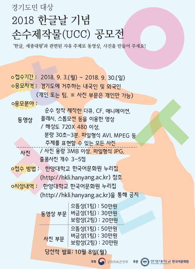 한양대학교 한국어문화원(원장 김태경)은 문화체육관광부가 주최하고 한양대학교 한국어문화원이 주관하는 <경기도민 대상 2018 한글날 기념 손수제작물(UCC) 공모전>을 실시한다.