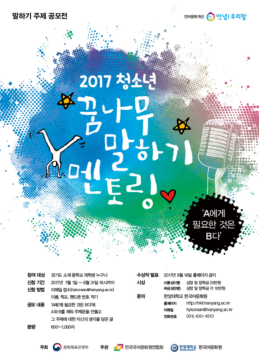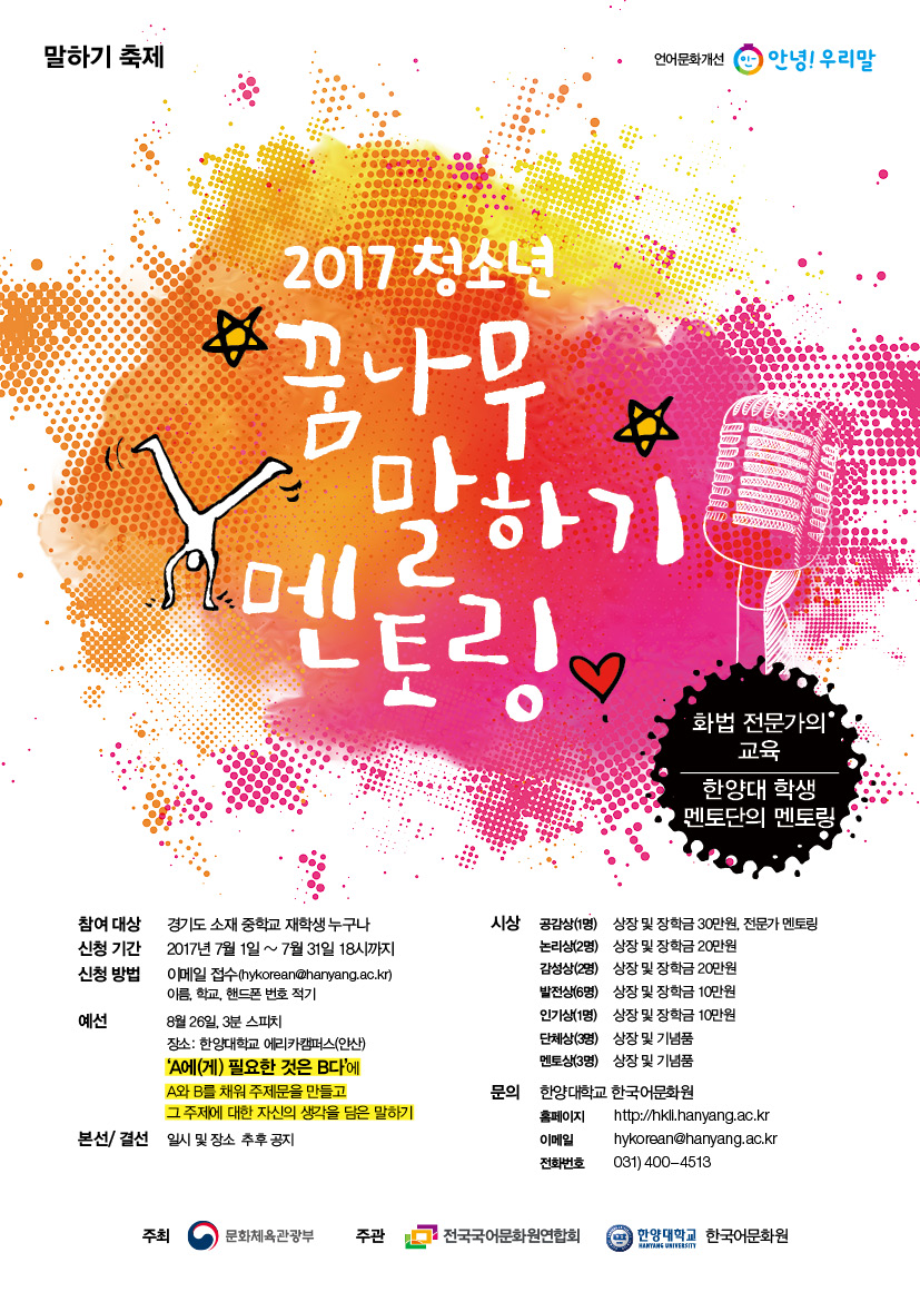 <2017 청소년 꿈나무 말하기 멘토링> ‘말하기 축제’는 예선, 본선, 결선으로 진행되며, 예선을 통과한 중학생들은 화법 교육과 대학생 멘토링을 받을 수 있고 참가자 전원에게는 참가 증명서가 발급된다. ‘말하기 축제’ 접수는 7월 1일부터 7월 31일까지이며, 예선은 8월 26일에 치러진다. ‘말하기 주제 공모전’ 접수 기간은 7월 1일부터 8월 31일까지이며 당선작은 9월에 발표한다. 자세한 사항은 한양대학교 한국어문화원(누리집 http://hkli.hanyang.ac.kr/ 전화 031-400-4513)으로 문의하면 된다.