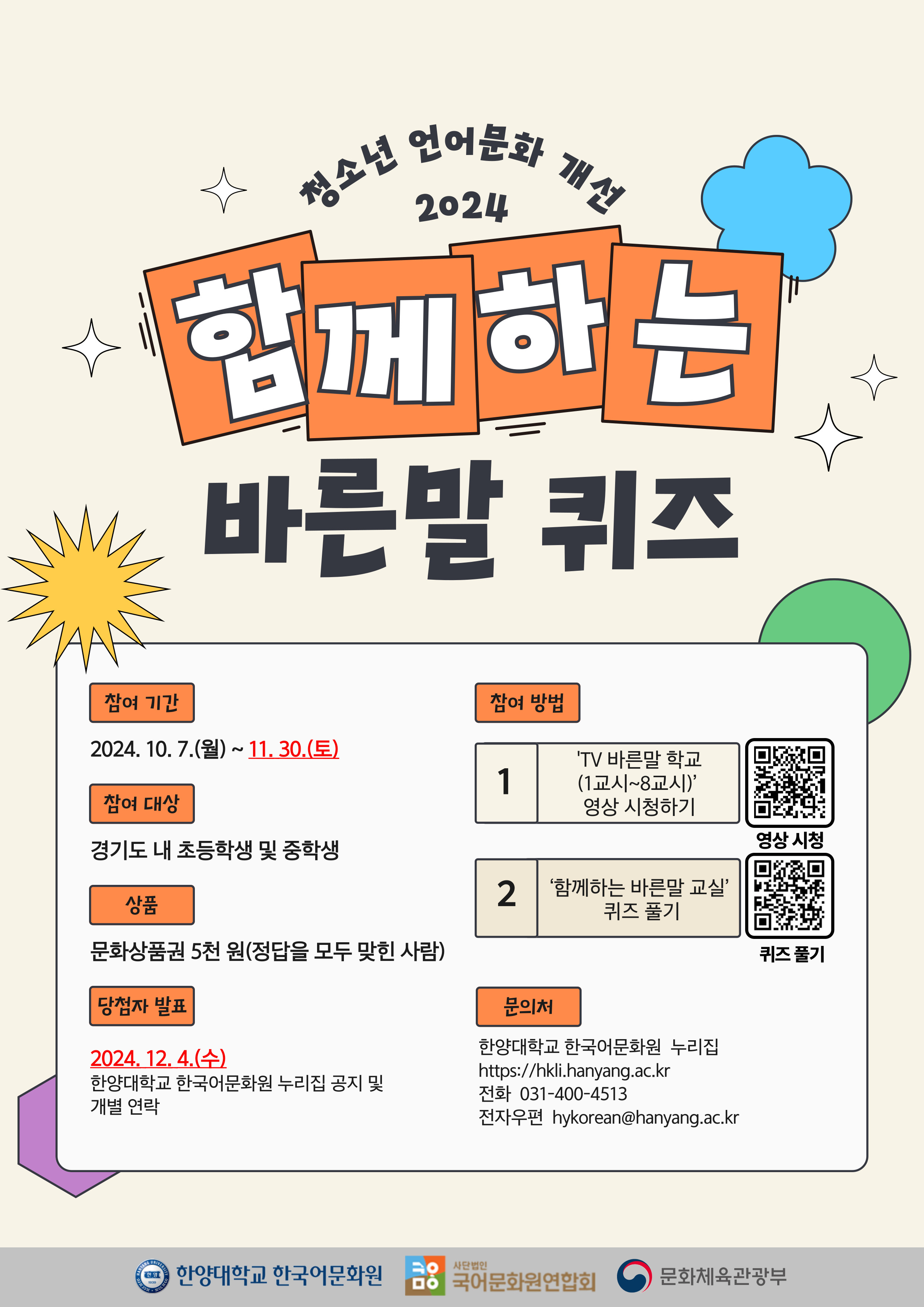 ■ 문의처: 한양대학교 한국어문화원(전화 031-400-4513/누리집 http://hkli.hanyang.ac.kr)