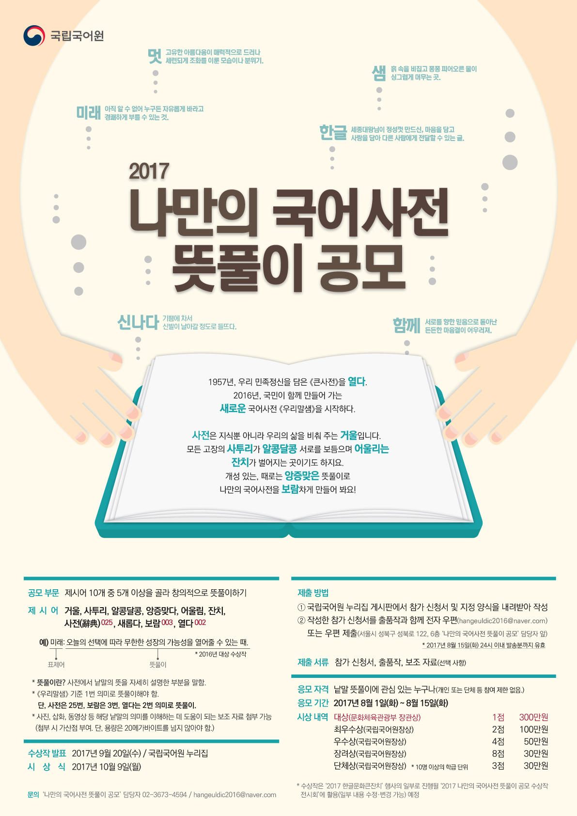 국립국어원(원장 송철의)은 국어사전에 대한 국민들의 관심을 불러일으키기 위해 ‘2017년 나만의 국어사전 뜻풀이 공모’를 개최한다. 올해로 제3회를 맞은 이 행사는 자기만의 개성을 담은 낱말 뜻풀이를 직접 해 봄으로써 우리말과 국어사전의 가치를 다시금 깨닫고, 일상생활에서 국어사전을 다양하게 활용할 수 있는 환경을 만들어 보자는 취지로 기획되었다.
