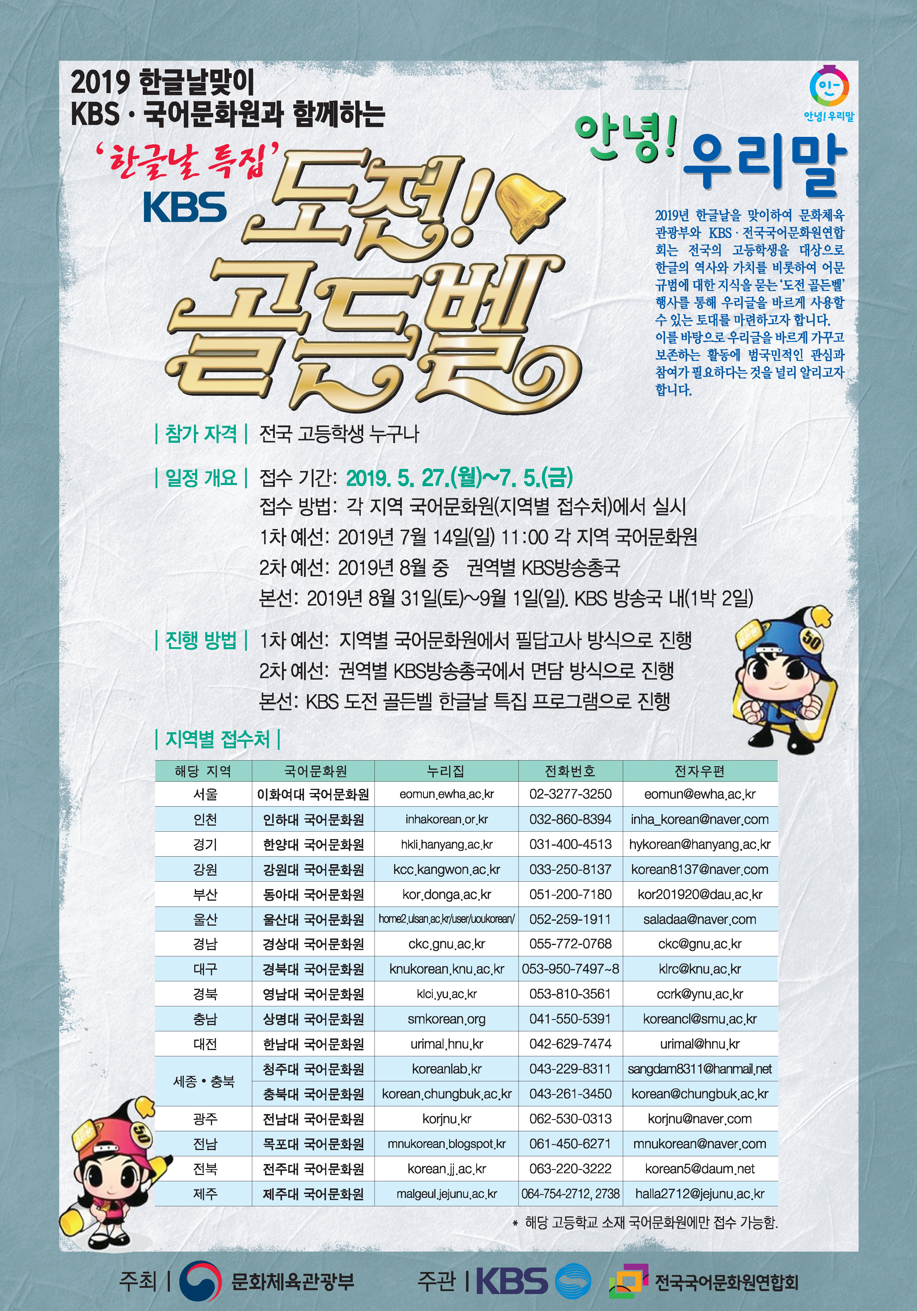 문화체육관광부의 주최로 전국국어문화원연합회에서는 2019년 한글날을 맞아 전국 고등학생들을 대상으로 한글에 대한 가치와 우수성을 살펴보고 청소년들의 바른 우리말 사용에 대한 재인식의 기회를 마련하고자 ‘KBS 도전 골든벨’ 한글날 특집 프로그램을 추진하고 있습니다.